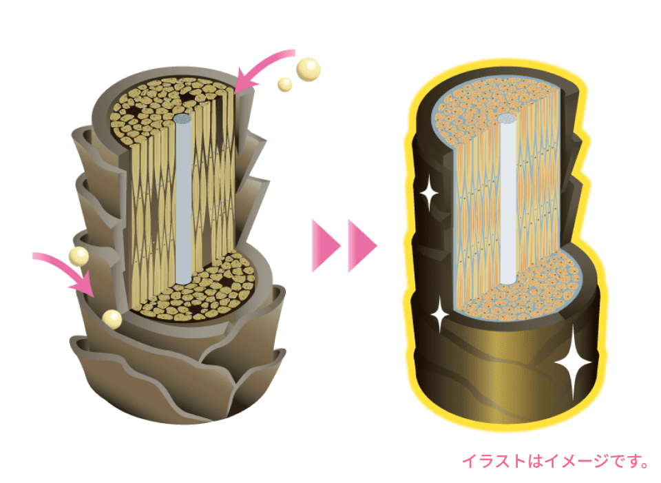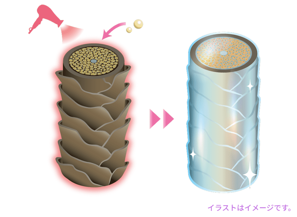 ドライヤーなどの熱を加えることで髪のタンパク質と結びつき、補修膜を形成します。